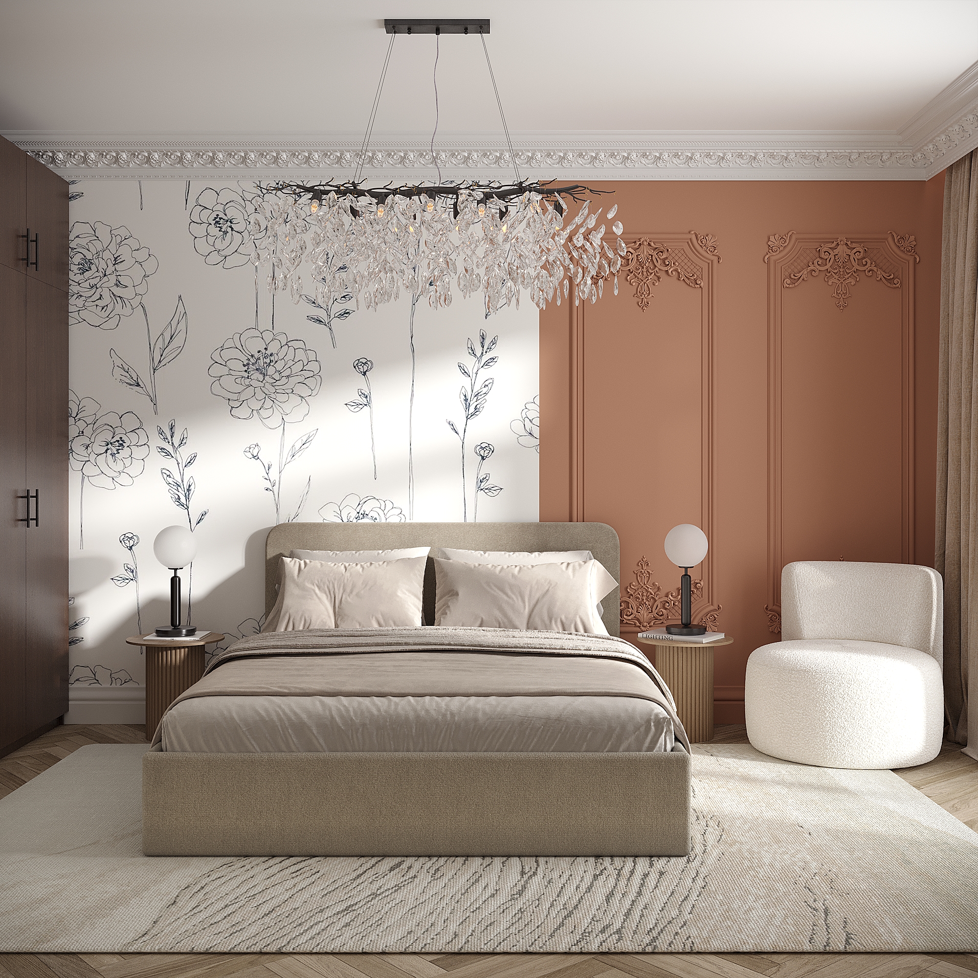 - Для великих спалень: Можна не обмежувати себе та обирати масивні ліжка з високим узголів’ям, доповнюючи їх туалетними столиками, пуфами чи навіть кріслом для читання.