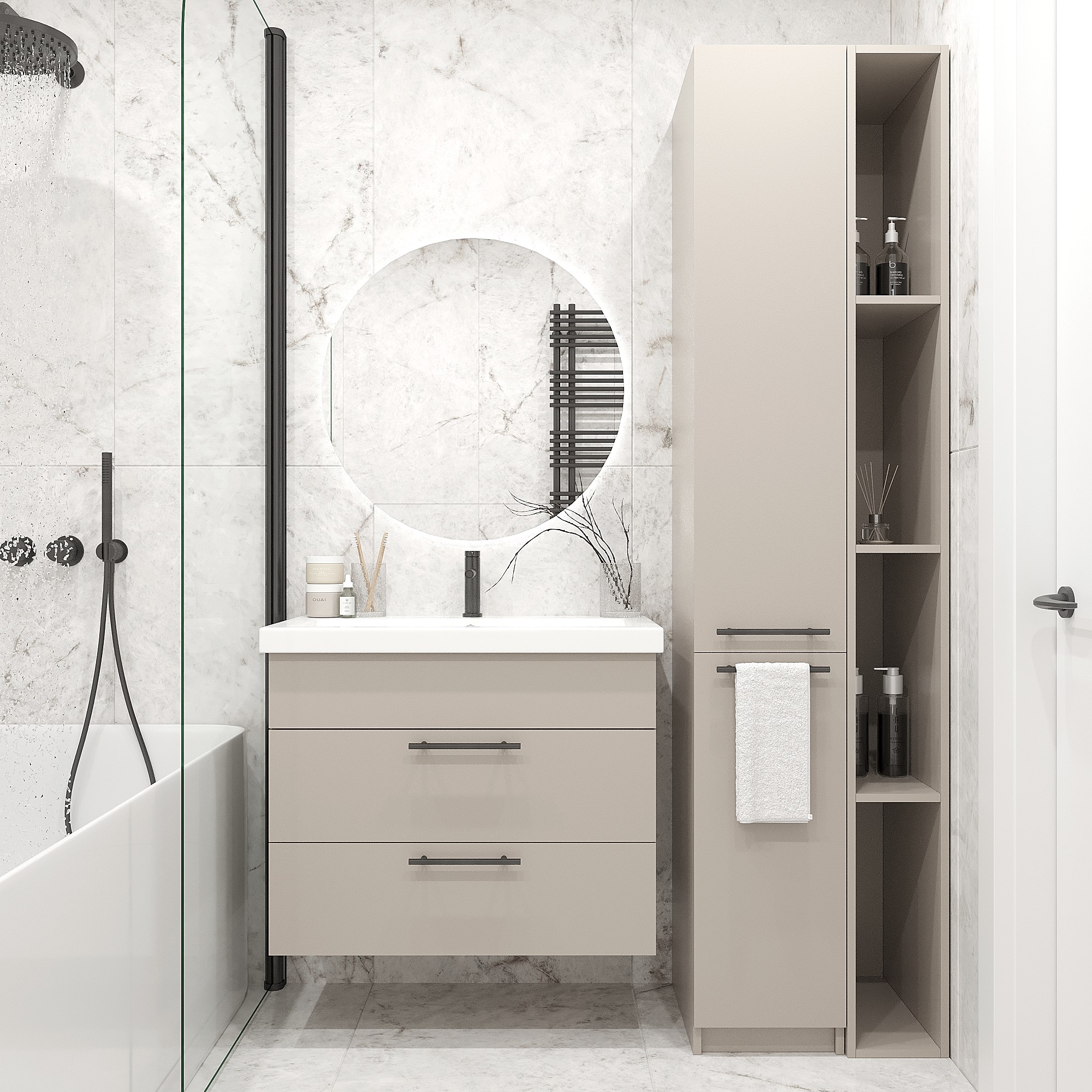 Комплект для ванної кімнати, що складається з трьох стильних предметів — підвісної тумби з умивальником, вузького шафи-пенала та елегантного стелажа з відкритими полицями — це ідеальне рішення для сучасних інтер’єрів. Компактні розміри та продуманий дизайн створюють гармонію у вашому просторі, забезпечуючи зручність і функціональність.