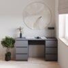 Функціональний письмовий стіл принесе комфорт та красу у ваш інтер’єр. Стійка із ящиками виконана як праворуч, так і ліворуч від столу. Стіл можна виготовити у різних комбінаціях кольорів з білими фасадами. Призначений для зручного розміщення комп’ютера та інших аксесуарів. Шухляди можуть використовуватись для зберігання документів, книг. канцелярського приладдя та інших дрібниць. Стіл може використовуватися як вдома, так і в офісі, адаптуючись під ваші особисті потреби. Письмовий стіл 754х1400х550 мм Корпус виготовлений із ламінованого ДСП.