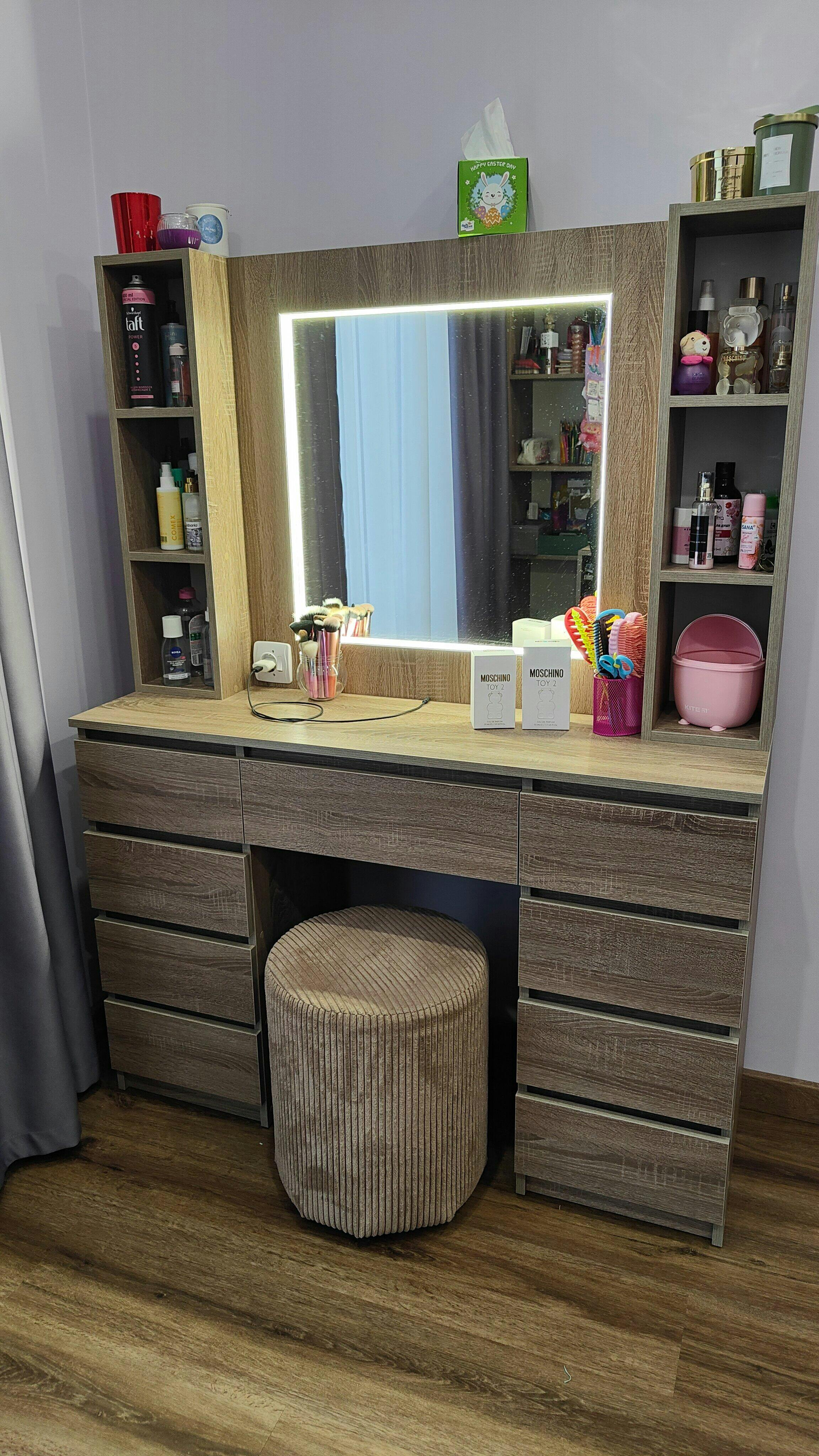 Туалетний столик з LED підсвіткою стане відмінним рішенням для створення повноцінної і комфортної робочої зони в домашніх умовах. Туалетний столик стане елегантним доповненням до спальної кімнати, яке дозволить кожній жінці відчути себе королевою. Сучасний дизайн столика підійде до будь-якого інтер’єру. Велике дзеркало допоможе враховувати всі деталі створення образа.