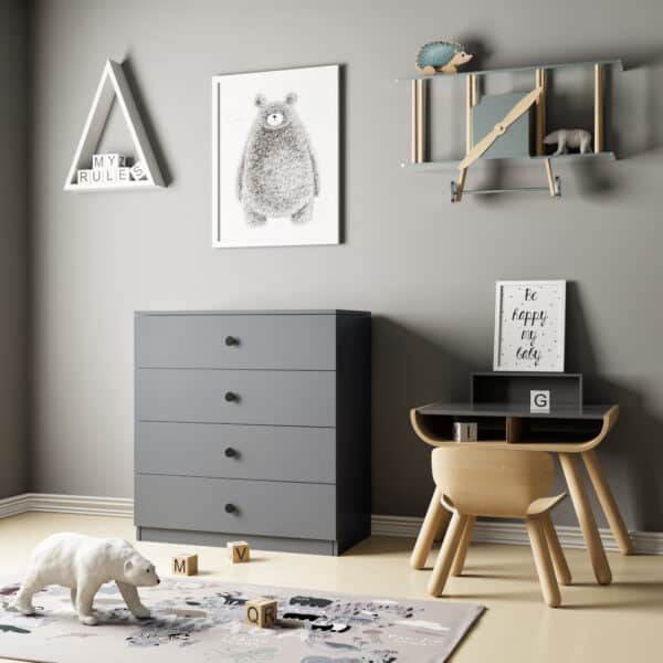 Конструкция: Комод оснащён четырьмя глубокими выдвижными ящиками с полным выдвижением, что обеспечивает удобный доступ ко всему содержимому.