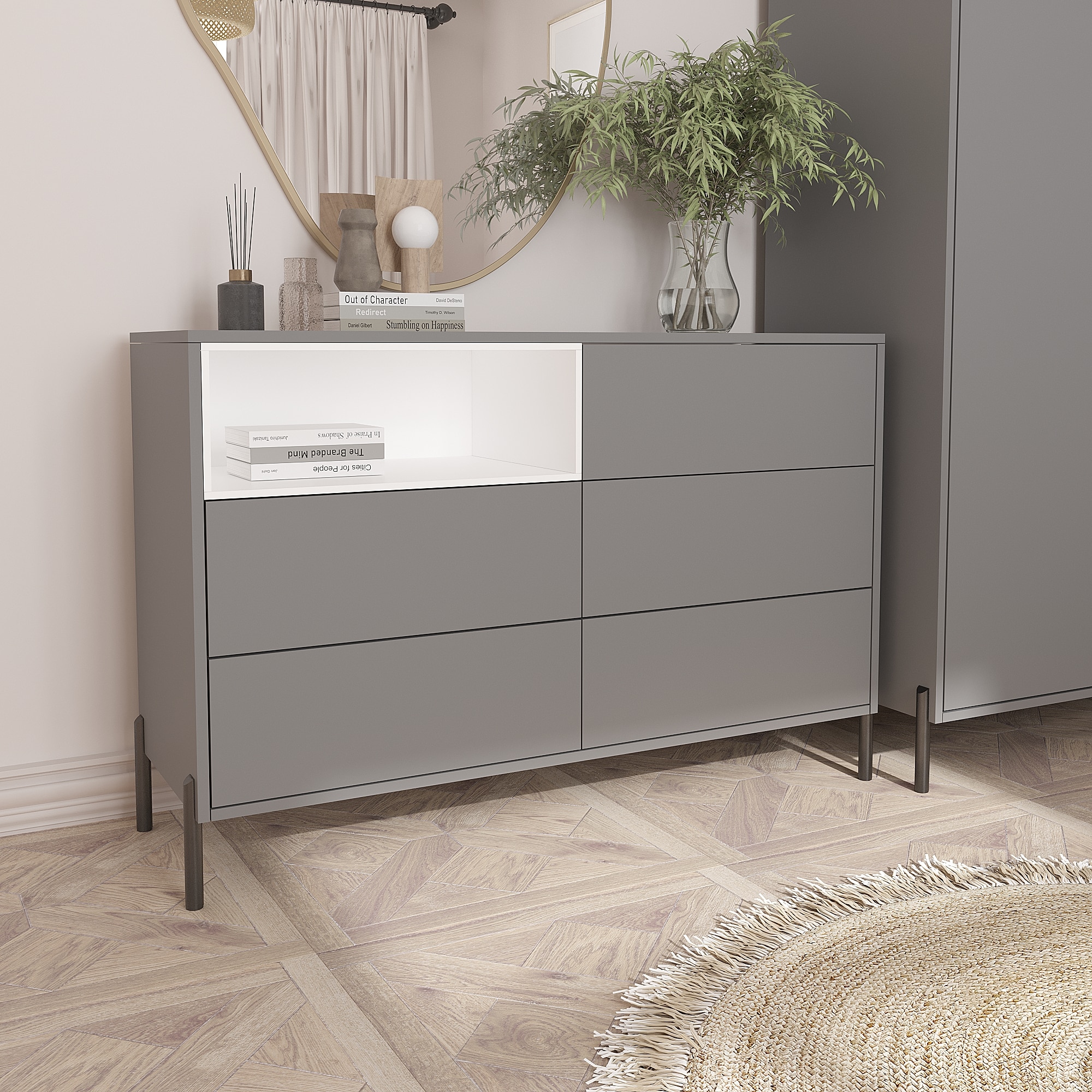 Элегантный и современный комод, выполненный из прочного ДСП толщиной 16 мм. Стильное сочетание двух цветов подчеркивает его утонченный дизайн. Комод устойчиво стоит на металлических ножках, что добавляет ему легкости и современности.