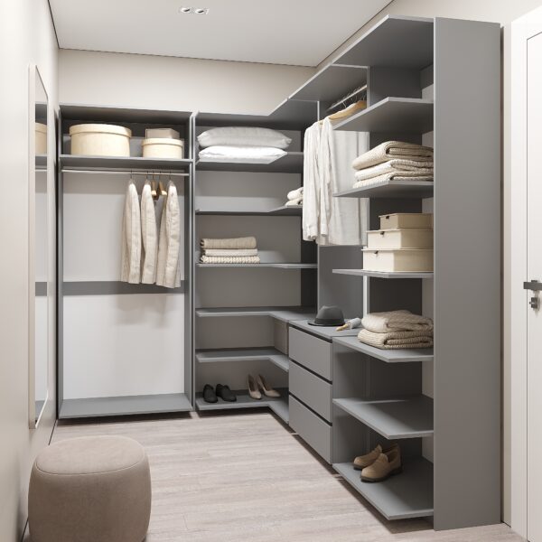 ✔ Функциональность – продуманное сочетание открытых полок, выдвижных ящиков и штанг для одежды делает систему максимально удобной.