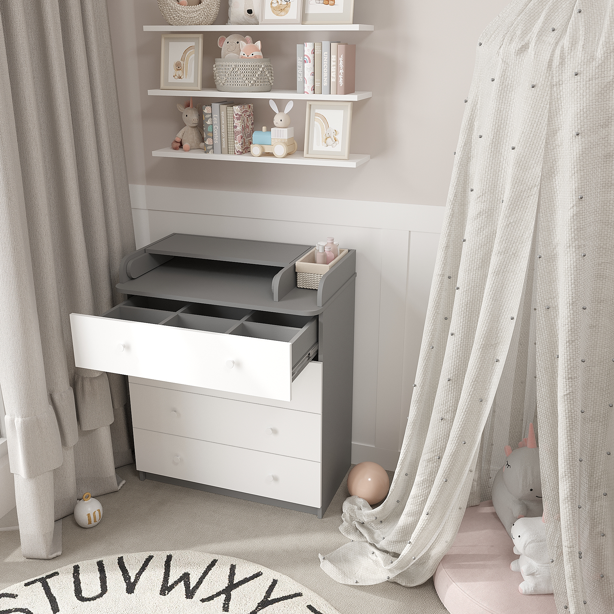 Благодаря эргономичной конструкции комод сочетает в себе пеленальный столик и место для хранения, экономя пространство в комнате. Плавный механизм выдвижения ящиков обеспечивает комфортное использование ежедневно.