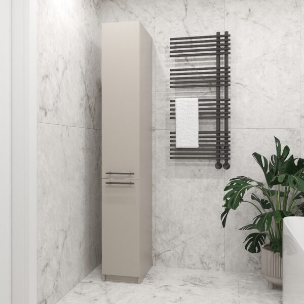 Элегантный и узкий шкаф-пенал с продуманной вертикальной конструкцией станет практичным решением для организации хранения в ванной.