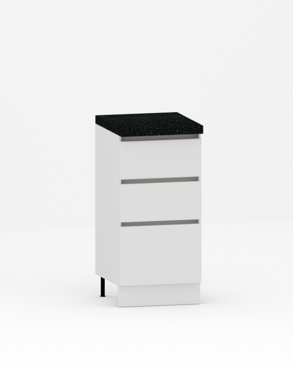 Нижний модуль для кухни с тремя ящиками, которые открываются за фасад без ручек.