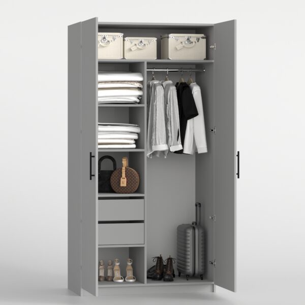Такой комплект шкафа имеет все необходимые отделения, ящики, полки и также штанги для одежды. Шкаф очень удобен в использовании и также имеет стильный вид.