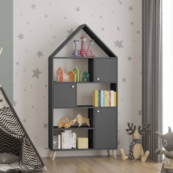 Стеллаж выполнен в оригинальном дизайне и прекрасно дополнит детскую комнату. Стеллаж имеет открытые и закрытые полки разных размеров. Буковые ножки из бука. Стеллаж для игрушек. Стеллаж деревянный. Стеллаж с полками. Стеллаж в детскую комнату. Купить книжный стеллаж для книг. Стеллаж для пола. Шкаф в детскую. Шкаф в детскую с полками.