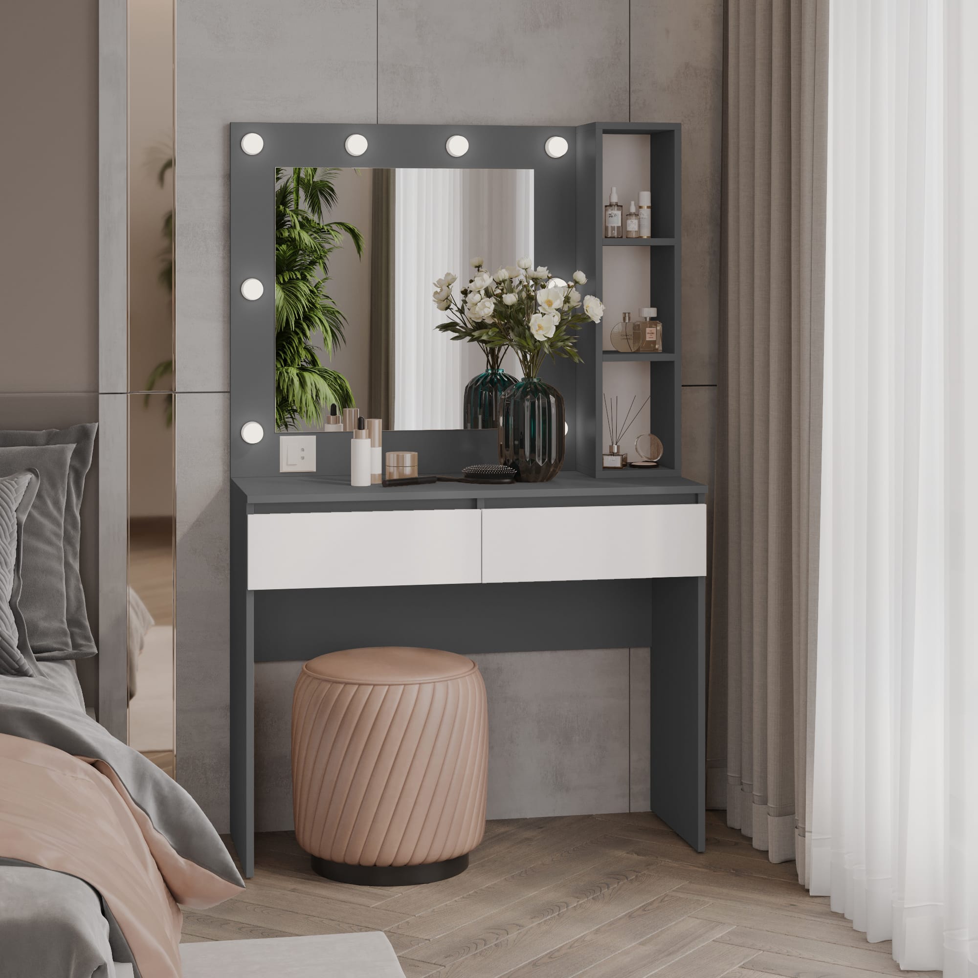 Туалетный столик станет отличным решением для создания полноценной и комфортной рабочей зоны в домашних условиях или для работы в салоне. Туалетный столик элегантно дополнит спальную комнату, и позволит каждой женщине почувствовать себя королевой. Современный дизайн столика подойдет к любому интерьеру. Большое зеркало поможет учитывать все детали создания образа. Преимущества столика: – дополнительное освещение – занимает минимальную площадь – легко очищаемая поверхность – выдвижные ящики Вы также можете использовать его для хранения ваших украшений и других мелочей. *Зеркало входит в комплект. *Лампочки в комплект не входят. Материал столика: ДСП Ламинированное 16мм