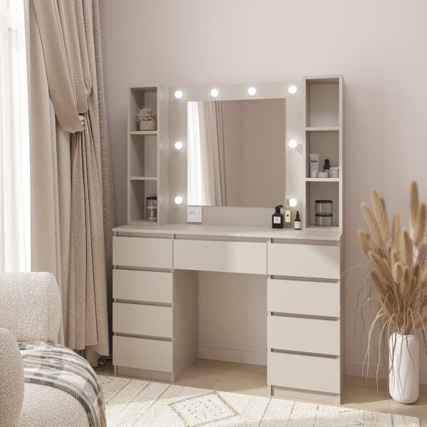 Туалетный столик станет отличным решением для создания полноценной и комфортной рабочей зоны в домашних условиях. Туалетный столик станет элегантным дополнением к спальной комнате, которое позволит каждой женщине почувствовать себя королевой. Современный дизайн столика подойдет к любому интерьеру. Большое зеркало поможет учитывать все детали создания образа. Преимущества стола: – дополнительные боковые полочки – занимает минимальную площадь – легко очищаемая поверхность – выдвижные ящички Вы также можете использовать его для хранения ваших украшений и других мелочей. *Зеркало входит в комплект. *Лампочки в комплект не входят. Материал столика: ДСП Ламинированное 16мм, доступно в 11 цветах.