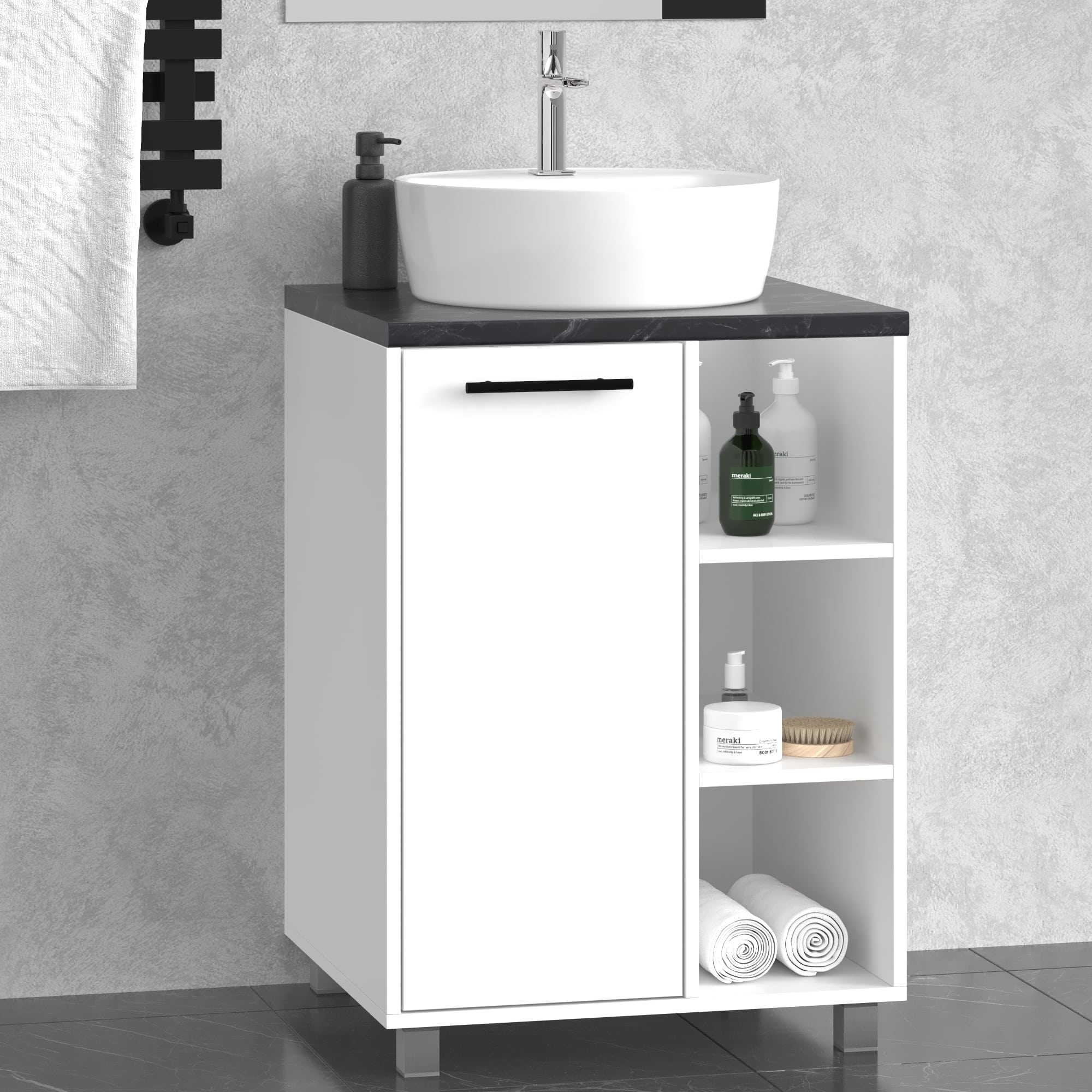Тумба с умывальником современного дизайна позволит создать стильный интерьер ванной комнаты. Тумба имеет полки как закрытые дверцей, так и открытые, что придает еще большего удобства и функциональности. Имеет пластиковые ножки. Влагостойкая столешница 28 мм и умывальник входят в комплект. Все отверстия вырезаны и подготовлены под умывальник.
